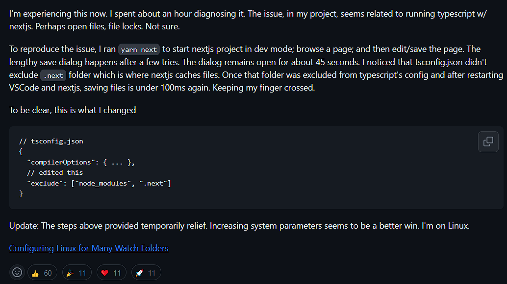 - 리액트에서 작업할때는 수정 및 저장시 지연 없이 Prettier format on save 기능이 동작했는데, Next에서는 짧게는 2~3초, 길게는 5초이상 해당 현상이 지속되어 여간 불편한게 아니였다.